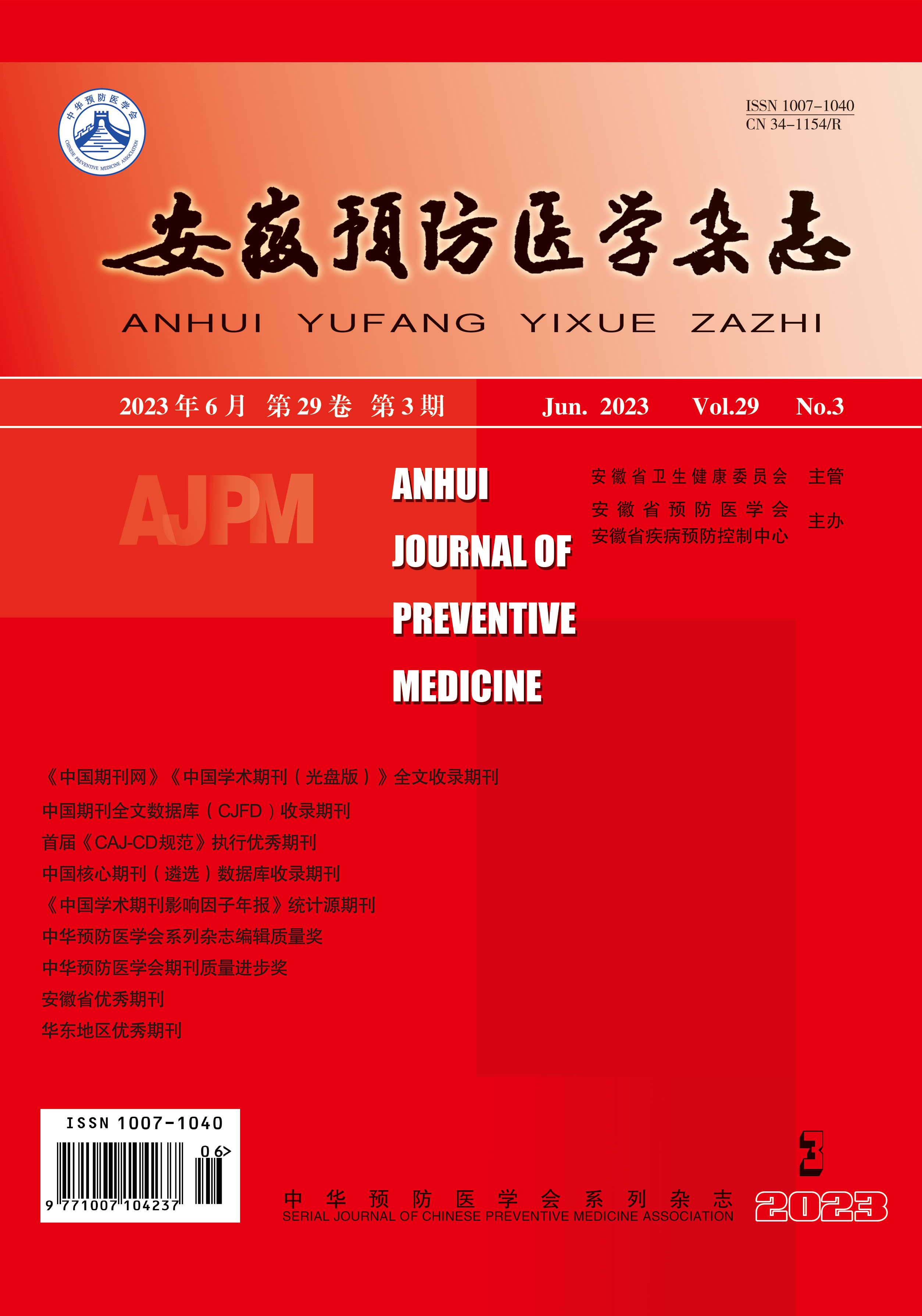 目的 分析1 035名中年人(45~59岁)抑郁、焦虑与压力的患病情况及其影响因素,为六安市防治工作提供依据。方法 依托于六安市慢性病危险因素调查项目,采用复杂抽样方法从六安市随机抽取2 942人,从中选择45~59岁的人群调查数据进行分析,共1 035人。采用抑郁-焦虑-压力量表(DASS-21)进行抑郁、焦虑与压力调查。结果 抑郁、焦虑和压力的总体患病率分别为8.99%、13.72%和9.76%。多因素logistic回归结果显示与男性相比,女性更容易患有抑郁(OR=2.314,95%CI:1.357~3.945)、焦虑(OR=2.544,95%CI:1.630~3.971)和压力(OR=2.552,95%CI:1.374~4.742)。患高血压是焦虑(OR=1.478,95%CI:1.021~2.141)和压力(OR=1.668,95%CI:1.087~2.560)的危险因素。与从不饮酒者相比,目前饮酒(OR=0.308,95%CI:0.117~0.810)是压力的保护因素;与家庭年人均收入<10 000元者相比,收入为10 000~20 000元是抑郁(OR=0.580,95%CI:0.352~0.955)的保护因素,>20 000元是抑郁(OR=0.437,95%CI:0.248~0.771)、焦虑(OR=0.395,95%CI:0.241~0.649)和压力(OR=0.297,95%CI:0.157~0.561)的保护因素。结论 1 035名中年人的抑郁、焦虑及压力的患病率均较高,六安市应针对女性、收入较低者、患有高血压者等重点人群进行防控。